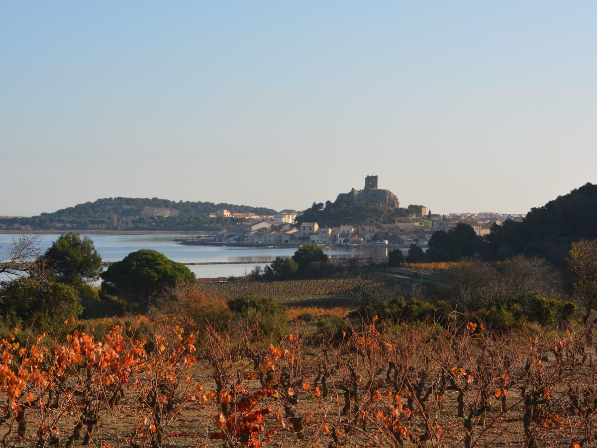 Sortie du bois, vue imprenable sur l’Étang de Gruissan, le village et la Tour.