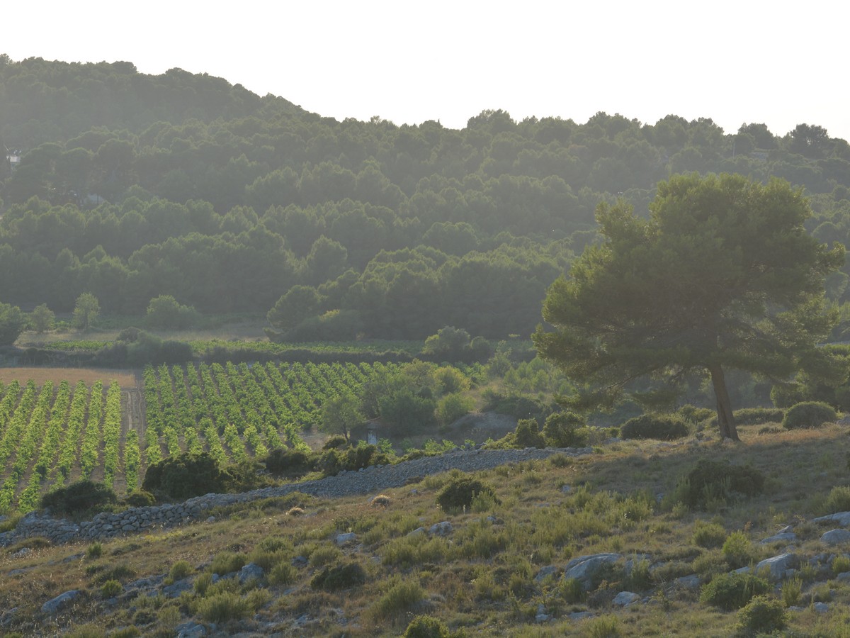Sortie du bois, prenez à droite pour suivre un sentier en bord de vigne, vue sur les domaines viticoles de “Berthélies” en face et de “Capitoul” à droite.
