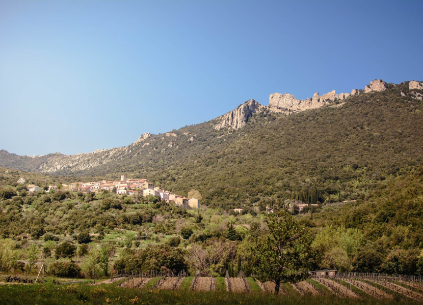 Au pied du château de Peyrepertuse, une passerelle s’avançant sur la vallée permet de profiter à la fois du point de vue sur le château au-dessus et sur le paysage en contrebas.