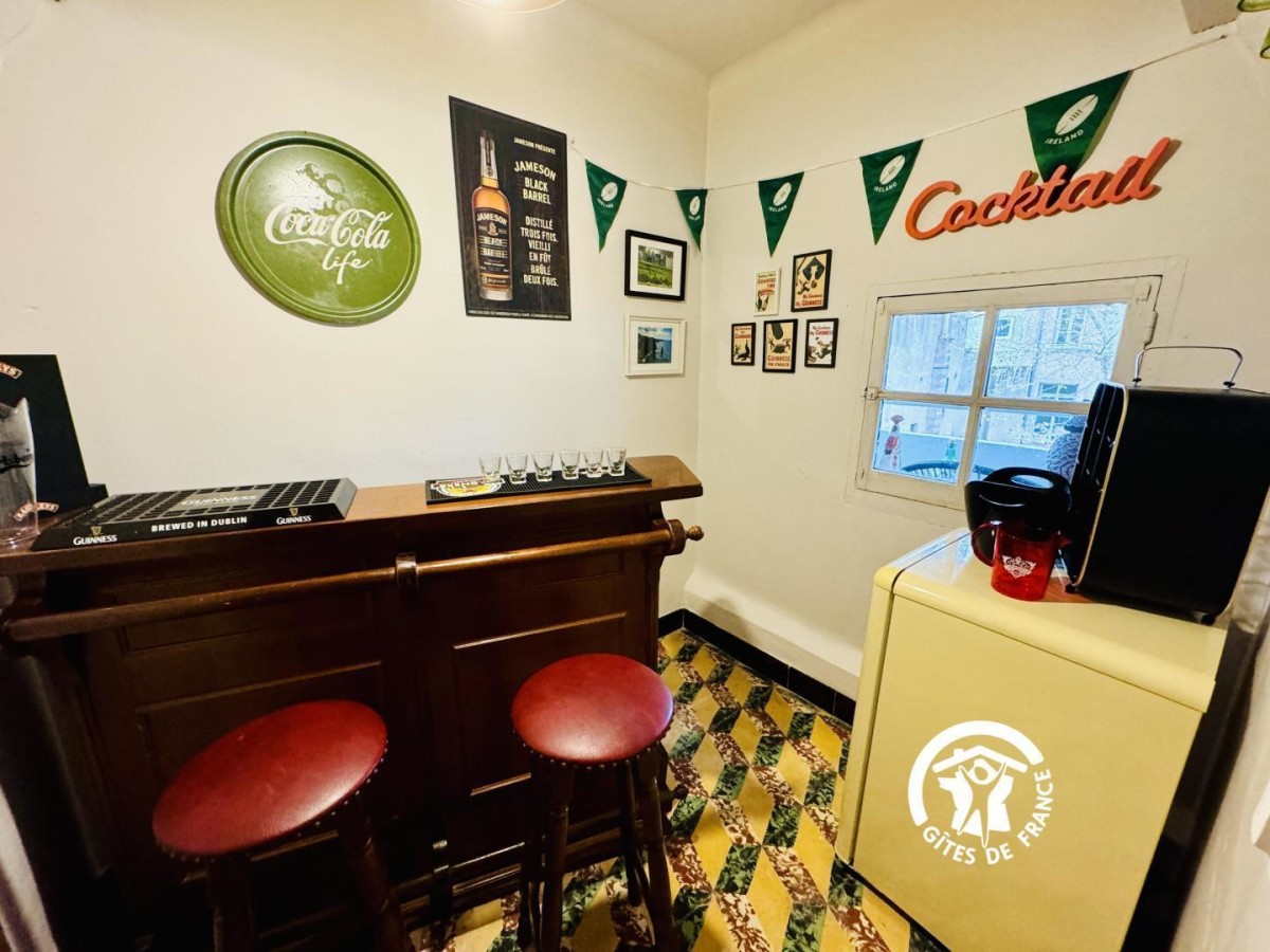 – Un salon avec canapé, fauteuils et TV connectée qui mène à une petite pièce insolite: un bar irlandais. Depuis le salon vous accèderez à la terrasse.