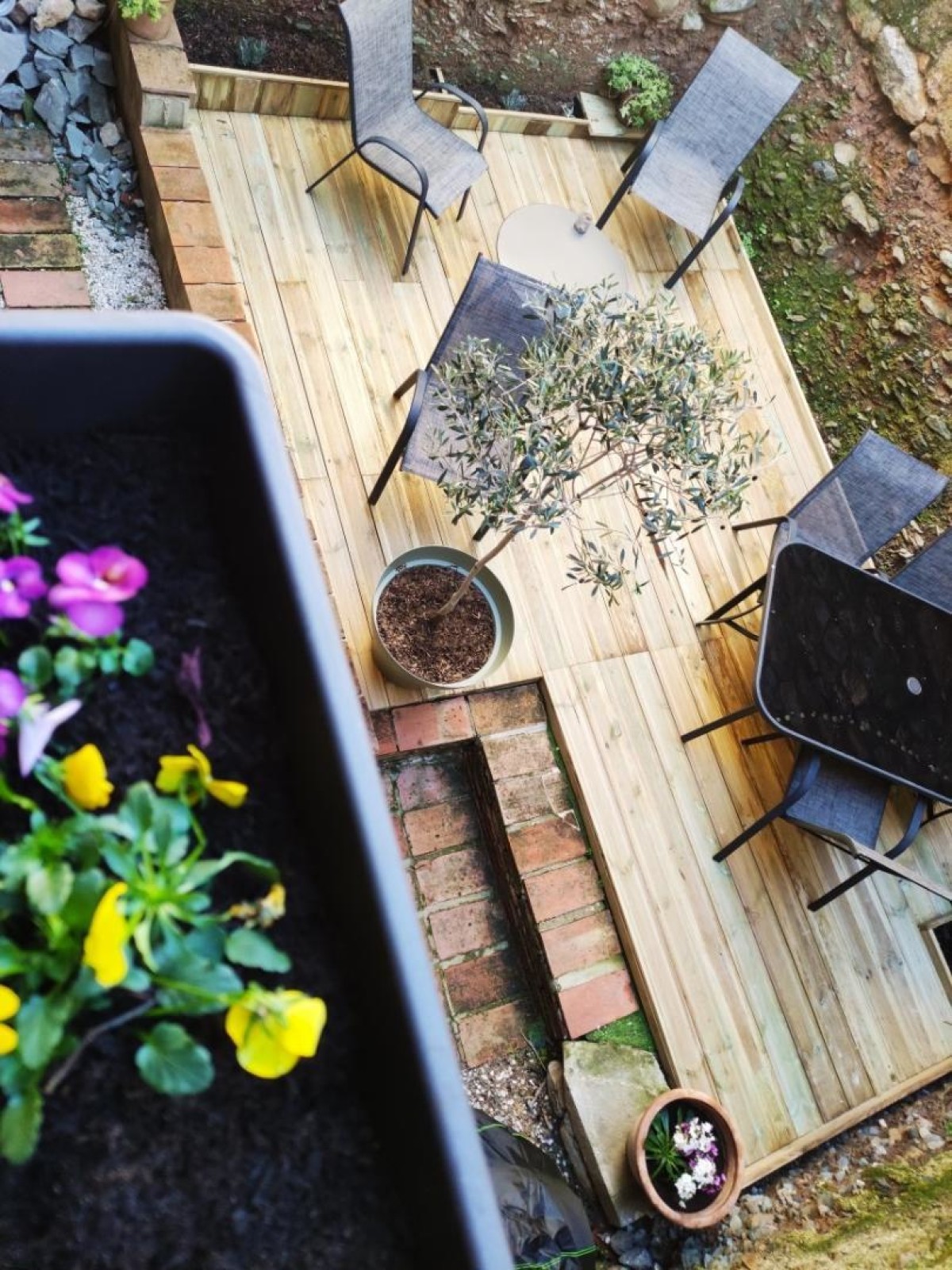 Depuis la cuisine, une cour privative, entourée de murs, sans vis-à-vis, avec mobilier de