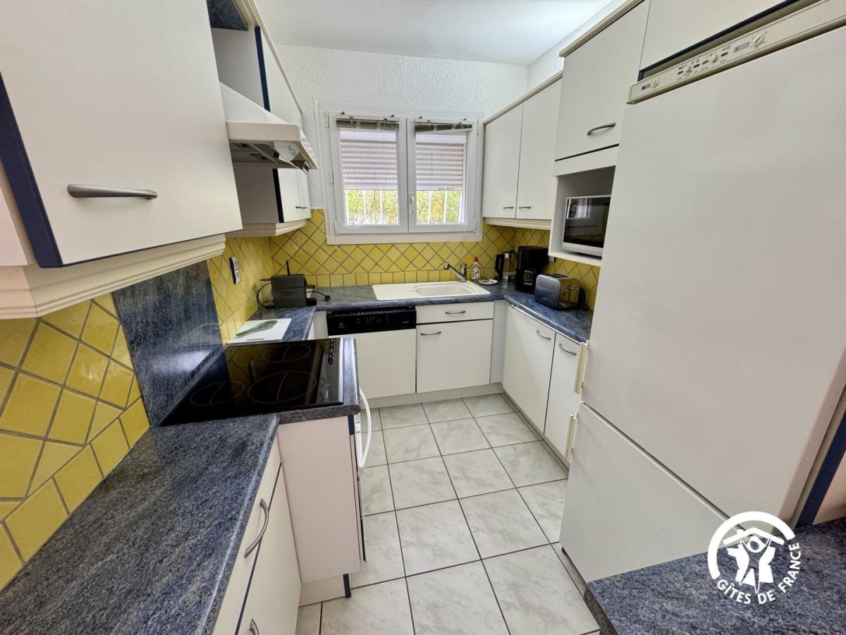 – Un séjour climatisé avec une cuisine ouverte toute équipée (cafetière filtre et expresso, lave-vaisselle, frigo-congélateur, micro-ondes, four), un coin salon avec canapé et TV et une table à manger. Le séjour donne direct sur la terrasse.