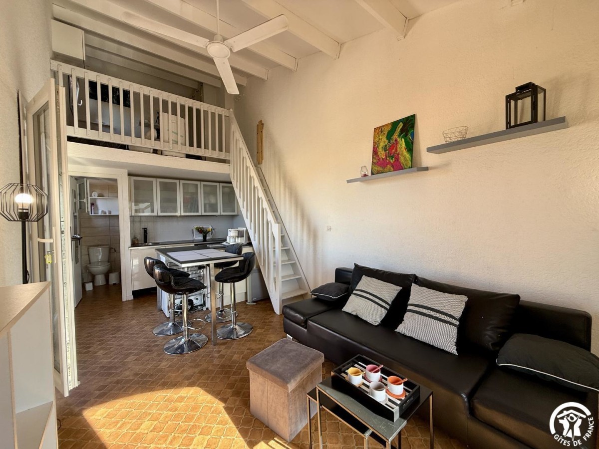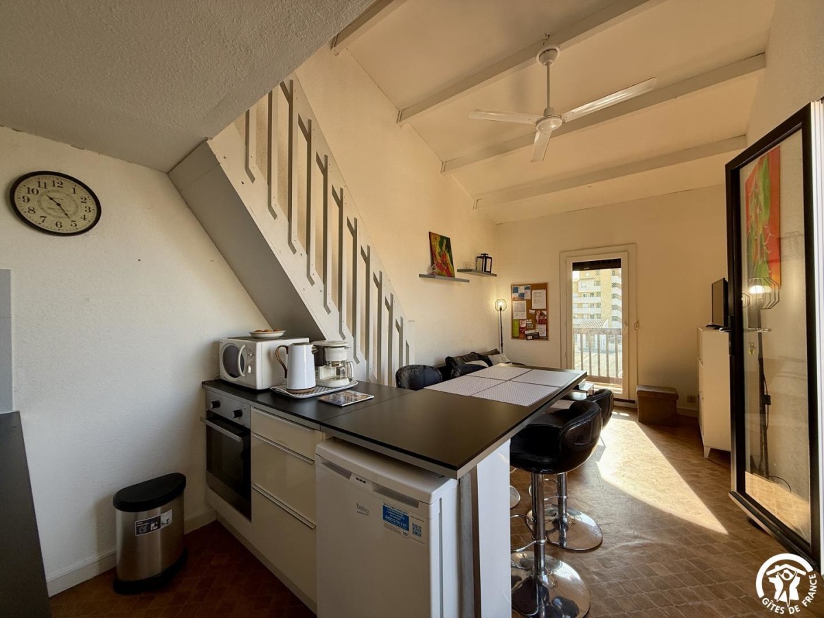 -Séjour-cuisine, équipé d’un canapé convertible deux places, donnant sur un balcon avec vue mer.