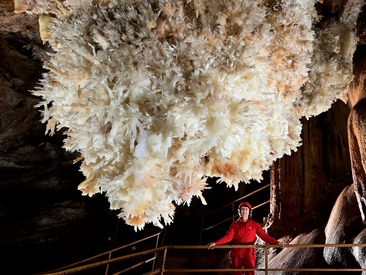 À partir du néolithique l’Homme préhistorique prendra sa place et la fréquentation ne cessera guère jusqu’au moyen âge. Les salles suivantes sont merveilleusement concrétionnées et à la fin, un pont suspendu au-dessus d’un miroir d’eau limpide vous mènera jusqu’au bouquet final : le “lustre” d’Aragonite, plus grand ensemble de cristaux d’aragonite répertorié au monde, sublimé par des jeux de lumière… Une merveille de la nature !