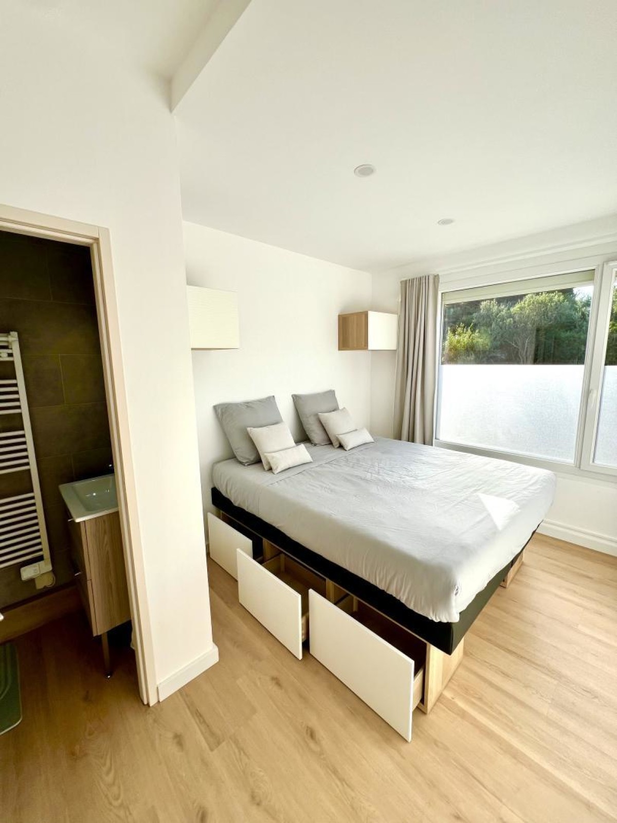 L’hébergement se trouve au rez-de-chaussée et propose une ambiance moderne d’inspiration méditerranéenne, parfaitement adaptée aux séjours en famille ou en télétravail. La pièce à vivre, lumineuse et ouverte, s’étend jusque sur la terrasse grâce à une large ouverture donnant vue sur le littoral. La cuisine ouverte est entièrement équipée : four, micro-ondes, plaque à induction, lave-vaisselle, réfrigérateur, congélateur, bouilloire et machine Nespresso. Deux chambres en suite avec salle d’eau (douche italienne) et des WC indépendants complètent les espaces de vie.