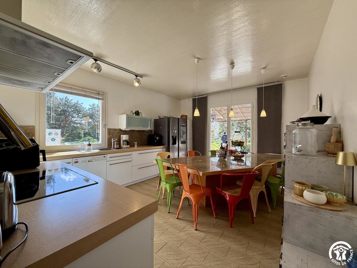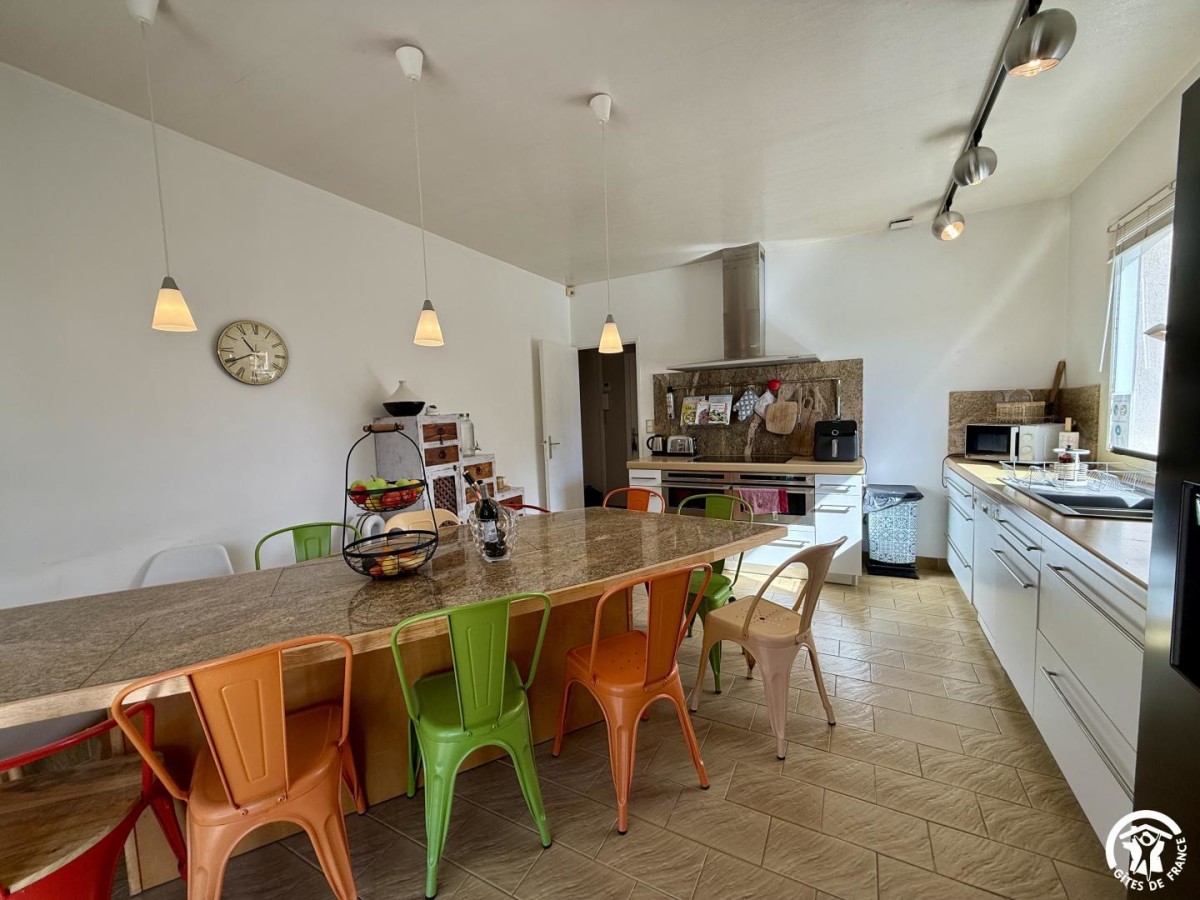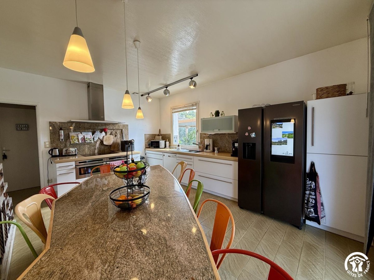 Gîte de plain-pied qui comprend un séjour avec table à manger, TV connectée à netflix et coin détente avec canapés. Cuisine intégrée et équipée avec un coin pour manger pour 12.