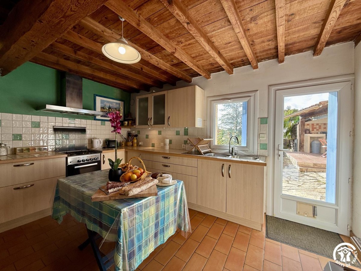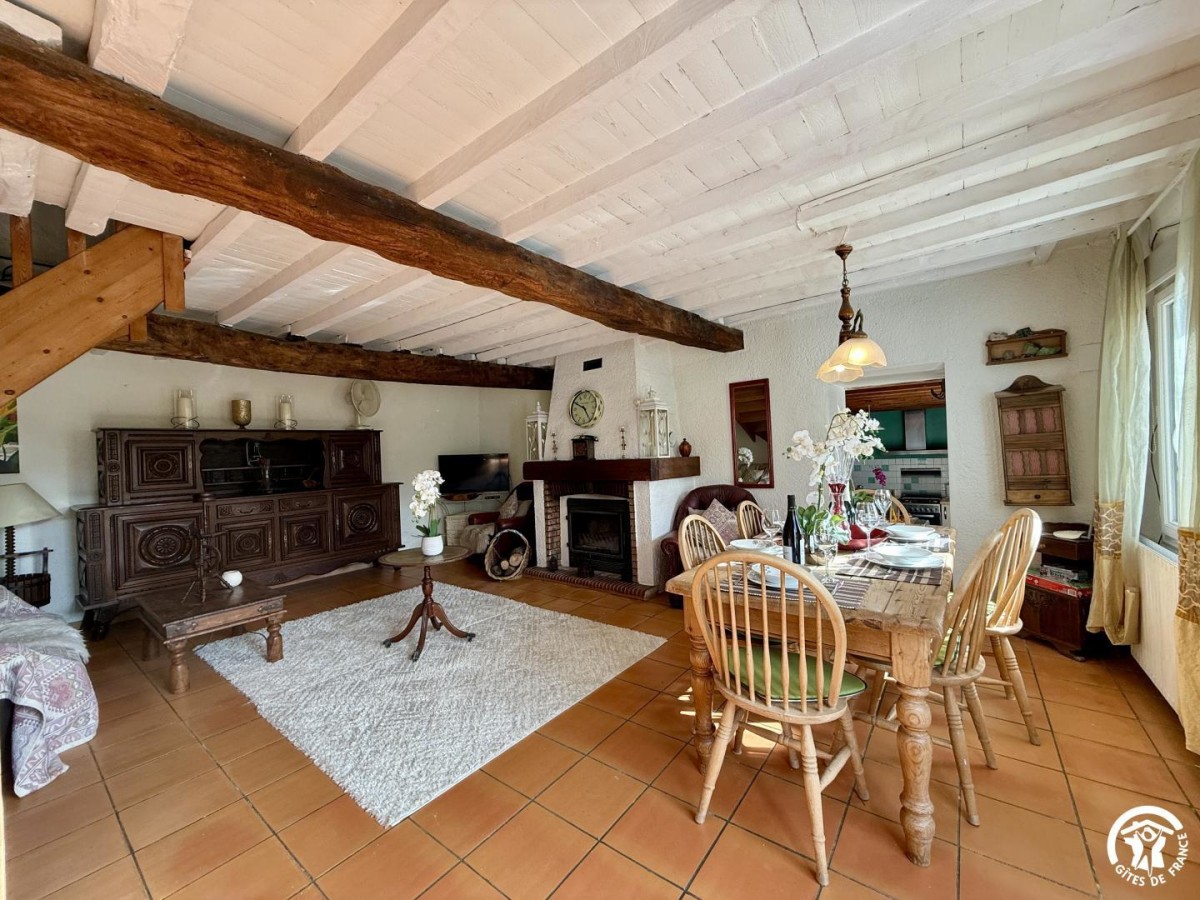La maison est mitoyenne, dans son esprit de campagne rustique, comporte plusieurs marches entre les pièces, et vous propose :