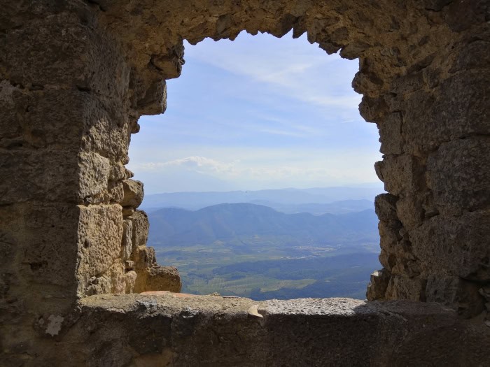 Du haut de ses 728m d’altitude, Quéribus surplombe les Corbières et on peut également deviner les Pyrénées par endroit.